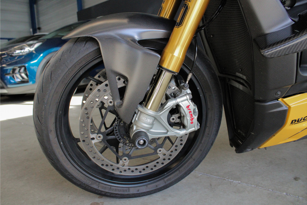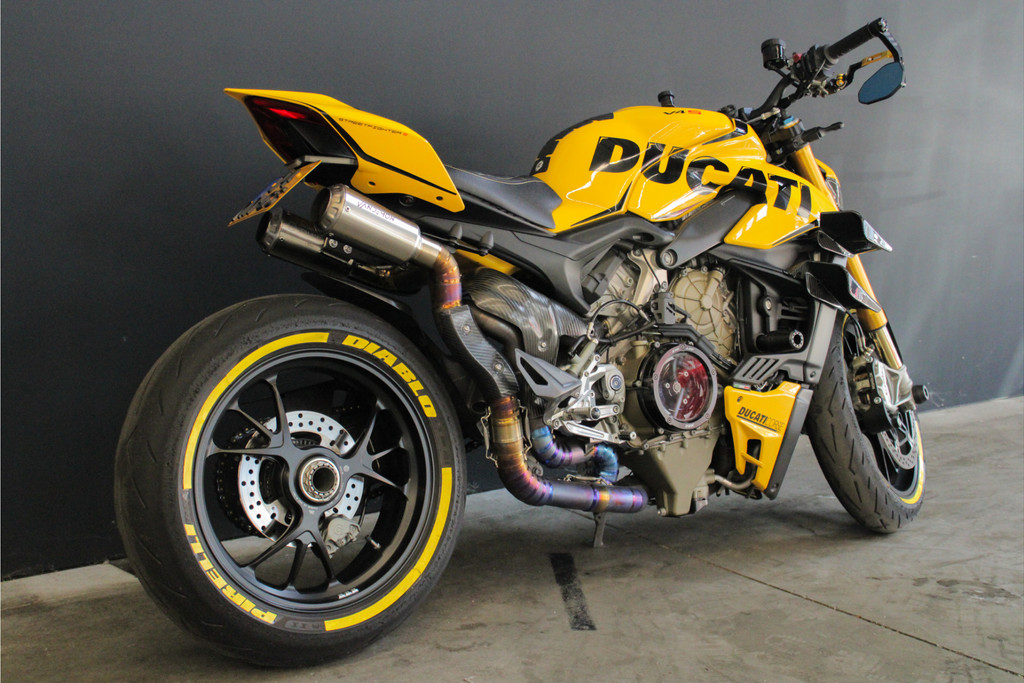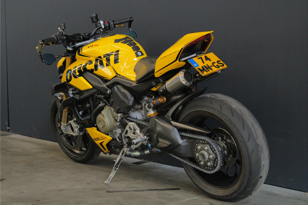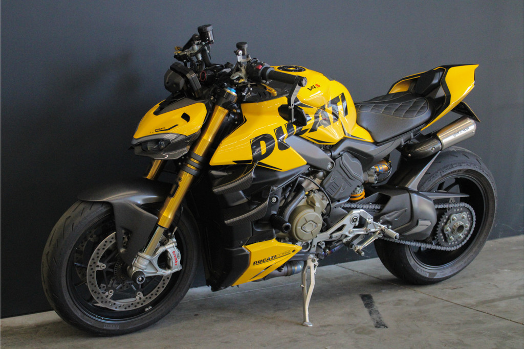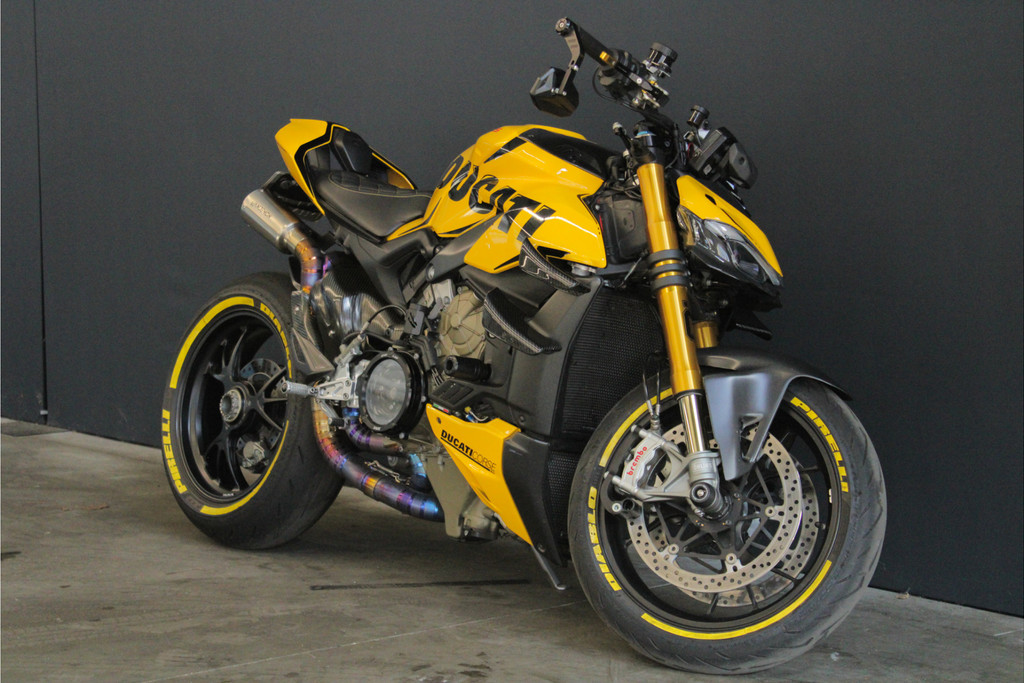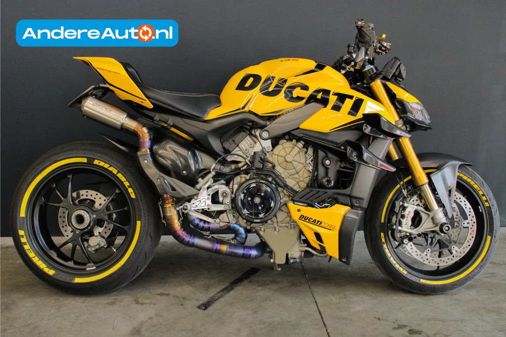 Unieke Ducati Streetfighter V4S! Dit betreft een Nederlands geleverde motor en is jaarlijks onderhouden bij de Ducati dealer. Recent heeft deze motor nog onderhoud gehad, de digitale servicehistorie is aanwezig samen met 2 sleutels, handzender voor het alarmsysteem en 2 sleutels van het wielslot, ook zit de originele Ducati map met een tal van extra onderdelen bij de motor! Verder is deze Ducati volledig gecustomised zowel optisch als technisch! Deze motor is voorzien van carbon delen, open koppelingshuis met verlichting, titanium Vandemon uitlaatsysteem, Up-map mapping, instelbare remhendels, handvat verwarming, custom zadel en zo nog veel meer! Met deze motor wordt nog gereden, de kilometerstand kan dus afwijken! Om deze motor te bekijken vragen we om een afspraak te maken! Kijk voor alle 50+ foto's op de website: www.andereauto.nl